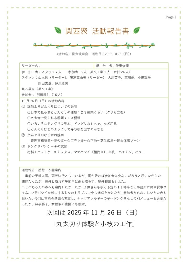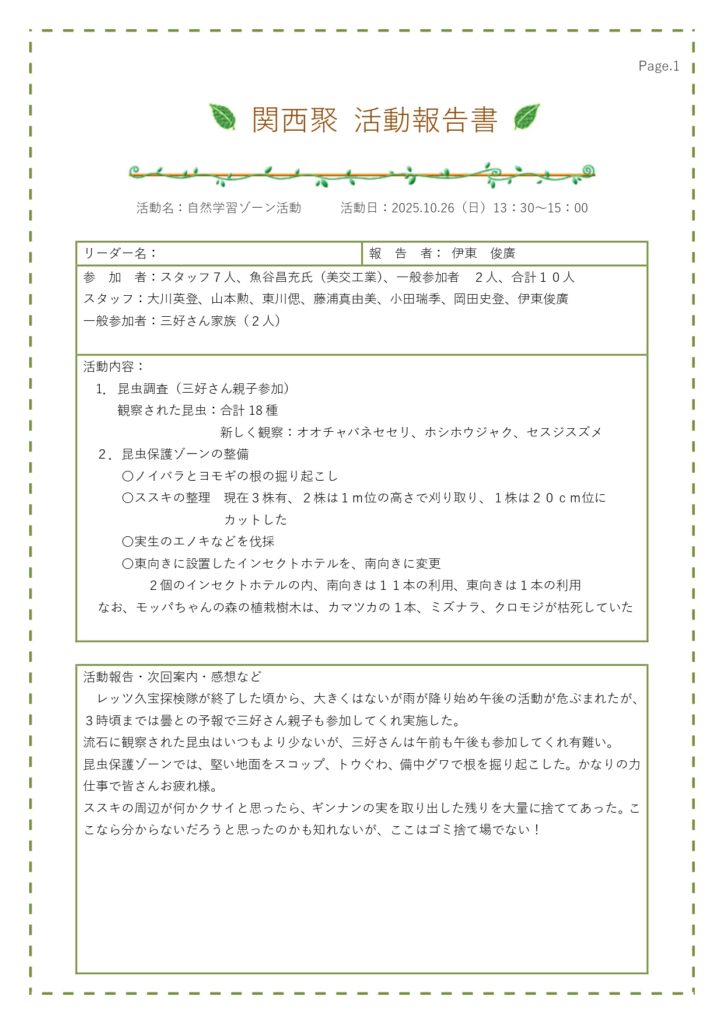 10月26日(日) 大阪府久宝寺緑地でレッツ久宝探検隊と自然学習ゾーン整備活動を行いました。