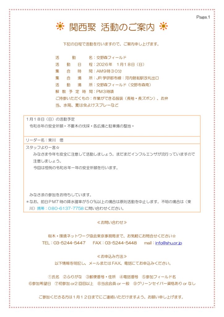 2026年1月18日(日) 交野森フィールドで本年最初の活動を行います。