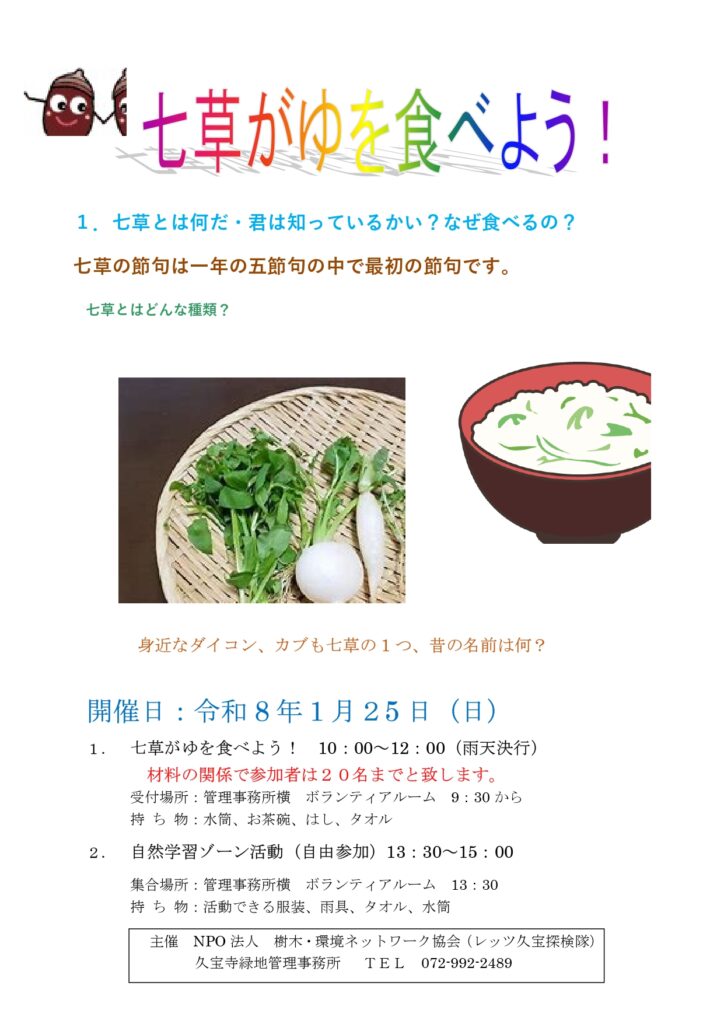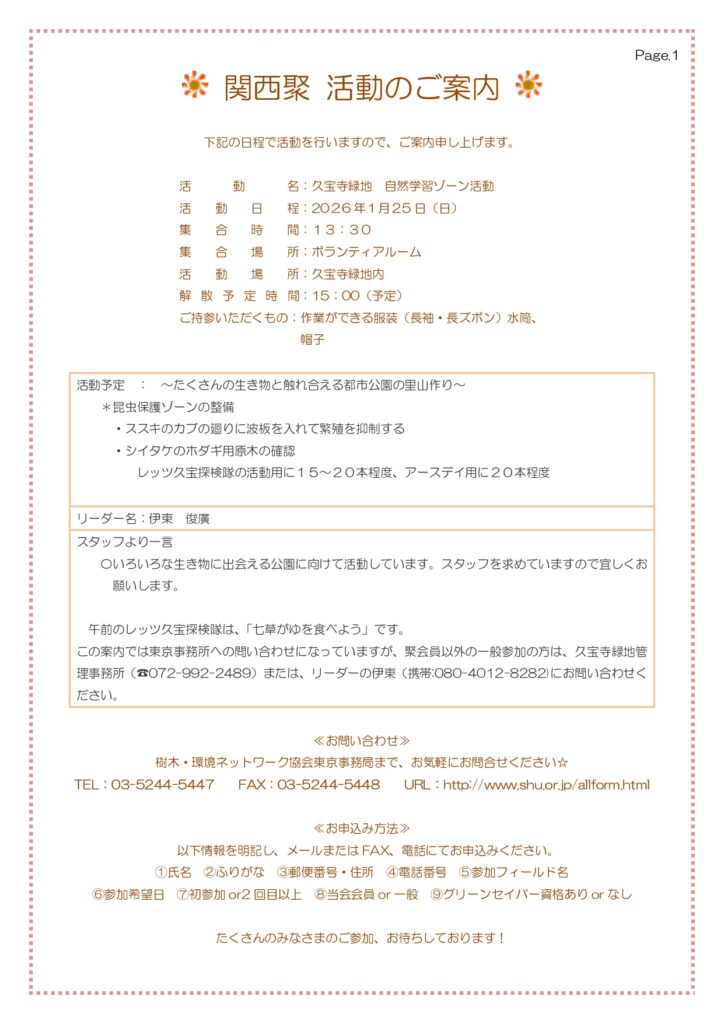 1月25日(日) 大阪府久宝寺緑地で活動を行います。 2026年1月24日 最終更新日時 : 2026年1月24日 kansaishu 午前中はレッツ久宝探検隊、午後は自然学習ゾーン整備活動を行います。詳細は下記の案内をご覧ください。
