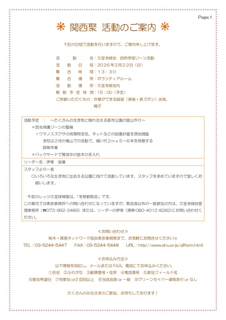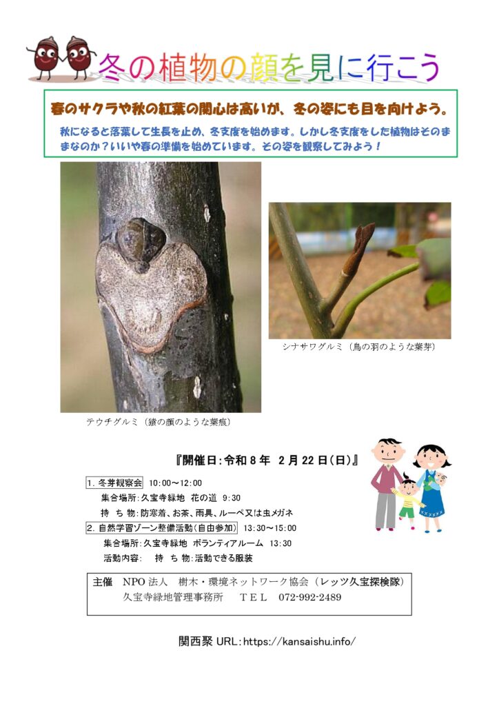 2月22日(日) 大阪府 久宝寺緑地でレッツ久宝探検隊と自然学習ゾーン整備活動を行います。 2026年2月21日 最終更新日時 : 2026年2月21日 kansaishu 午前中は、レッツ久宝探検隊「冬芽観察会」 午後は、自然学習ゾーン整備活動です。ご興味のある方は、ぜひ、ご参加ください!