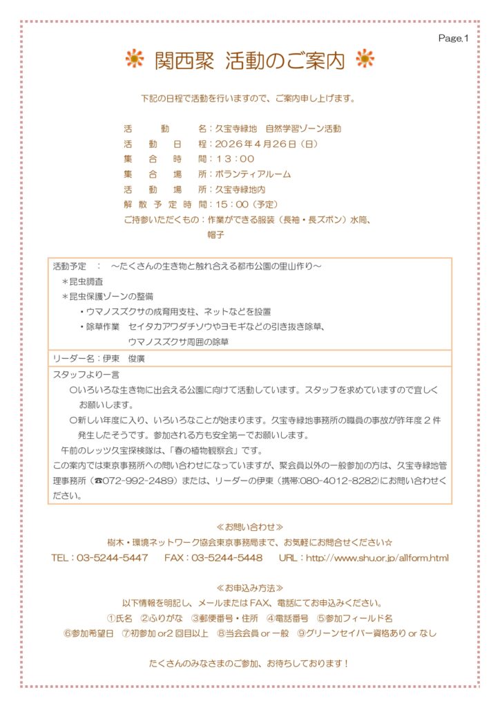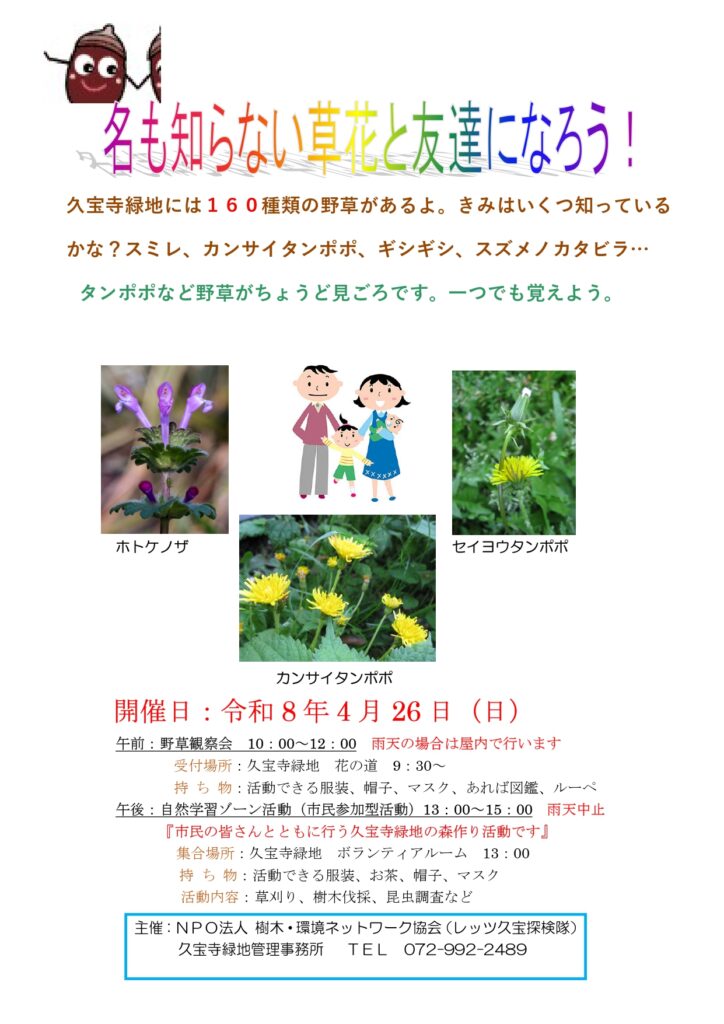 4月26日(日) 大阪府久宝寺緑地で、レッツ久宝探検隊と自然学習ゾーン整備活動を行います。 2026年4月10日 最終更新日時 : 2026年4月10日 kansaishu 午前はレッツ久宝探検隊「春の植物観察会」、午後は自然学習ゾーン整備活動です。ご興味のある方は、ご参加ください!